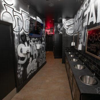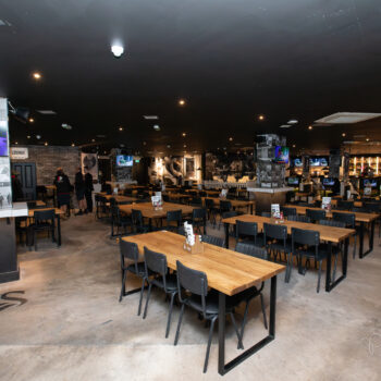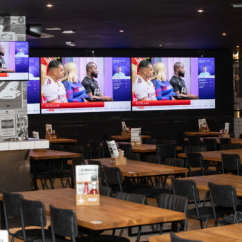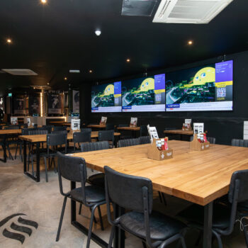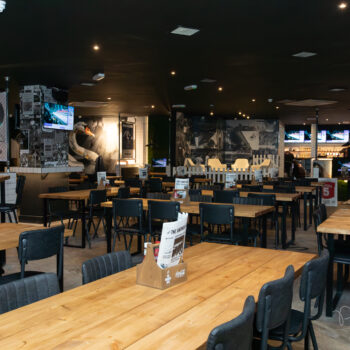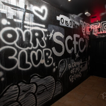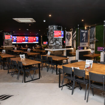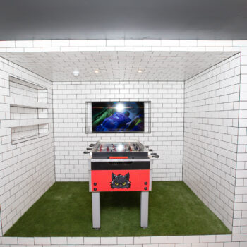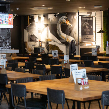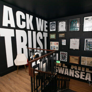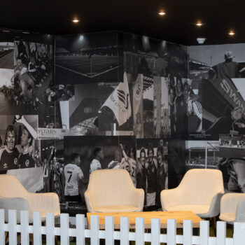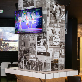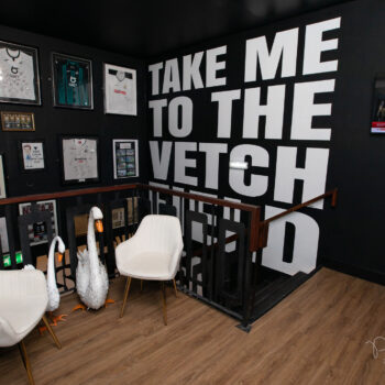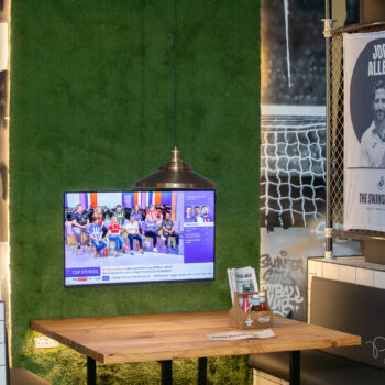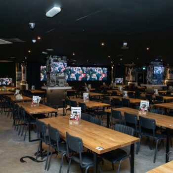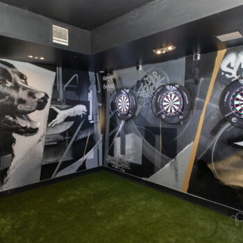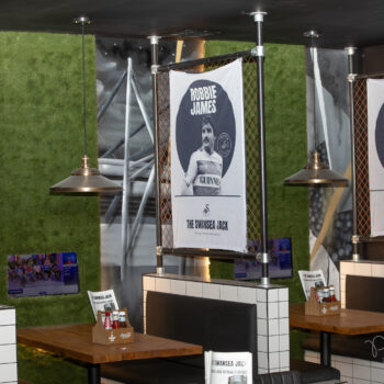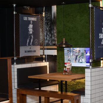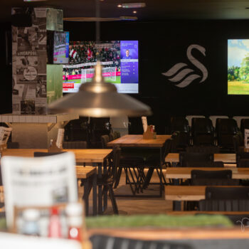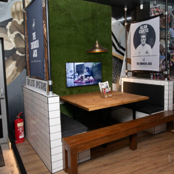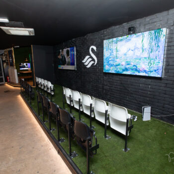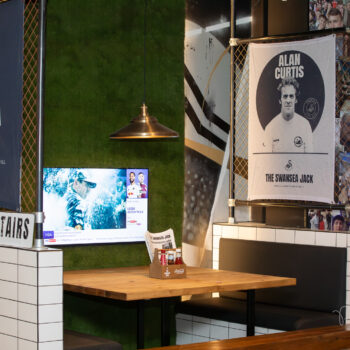Around the venue, 11 seated booths each celebrate a former Swansea City player, reinforcing the club connection. At the rear, an elevated Astroturf area with black and white stadium-style seating sits in front of 2 striking 200-inch televisions, creating a stadium feel while maintaining comfort. Additional features include a dartboard area with murals by Welsh graffiti artist JenksArt, a foosball zone and a stairwell lined with famous Swans chants, turning every corner into part of the experience.