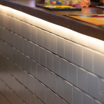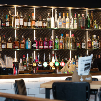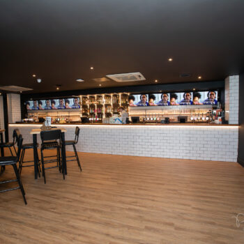 The bar itself required particular care. Translating the design from drawings into reality involved bespoke metalwork, black and white tiling that mirrors the club colours and integrated lighting to showcase spirits and glassware. The finished result is both visually strong and built to withstand the demands of a busy, high-footfall venue.