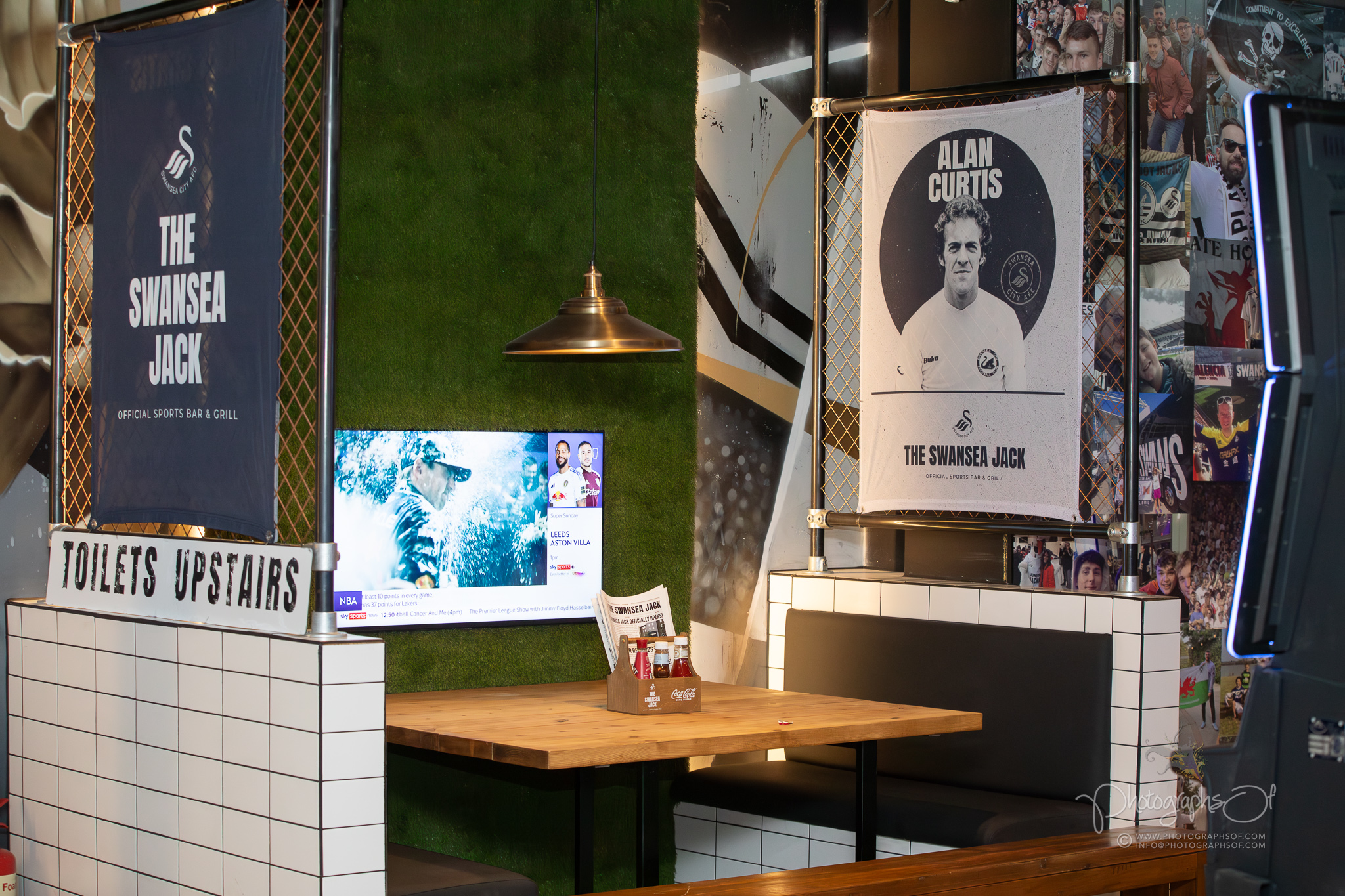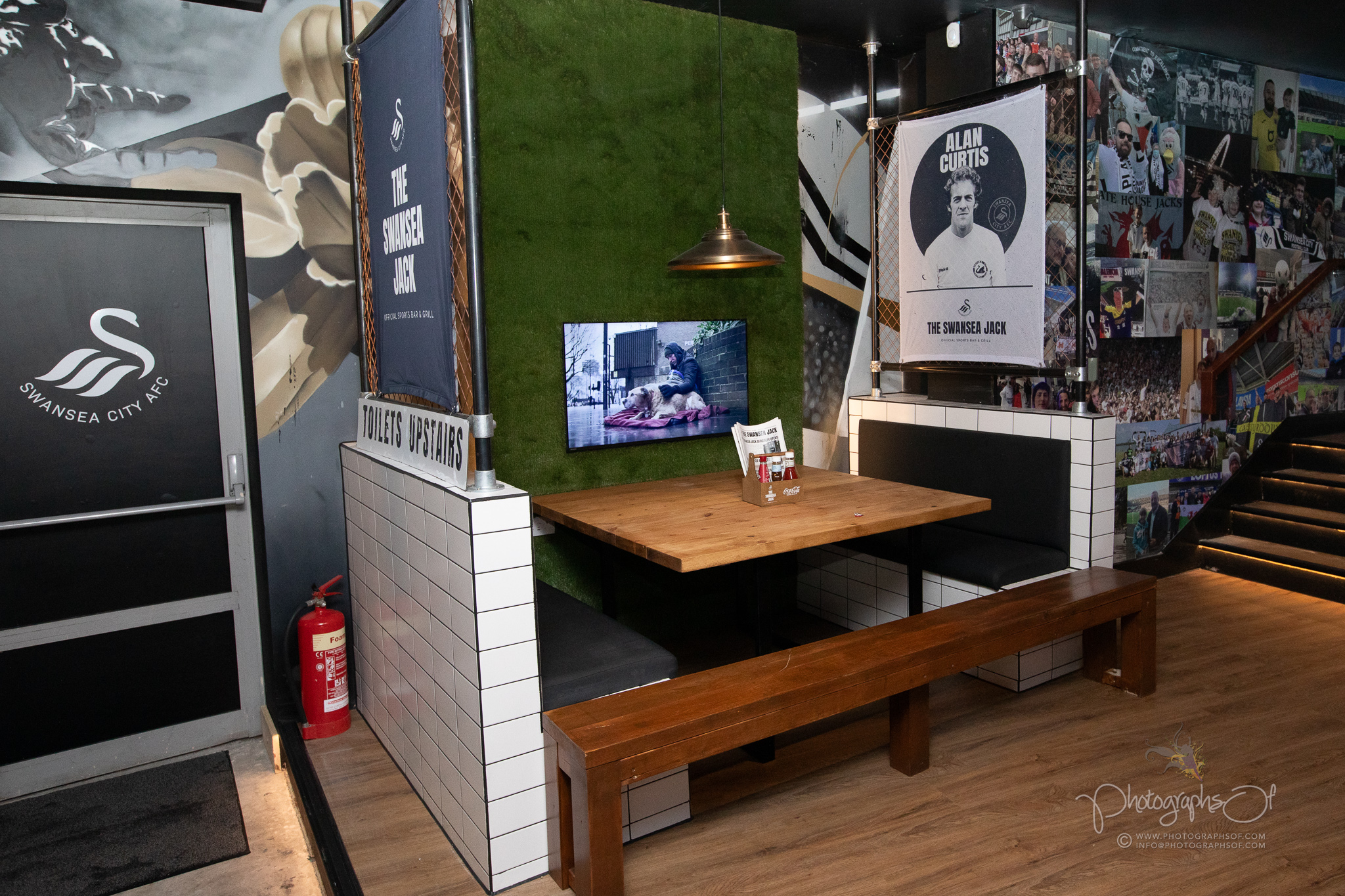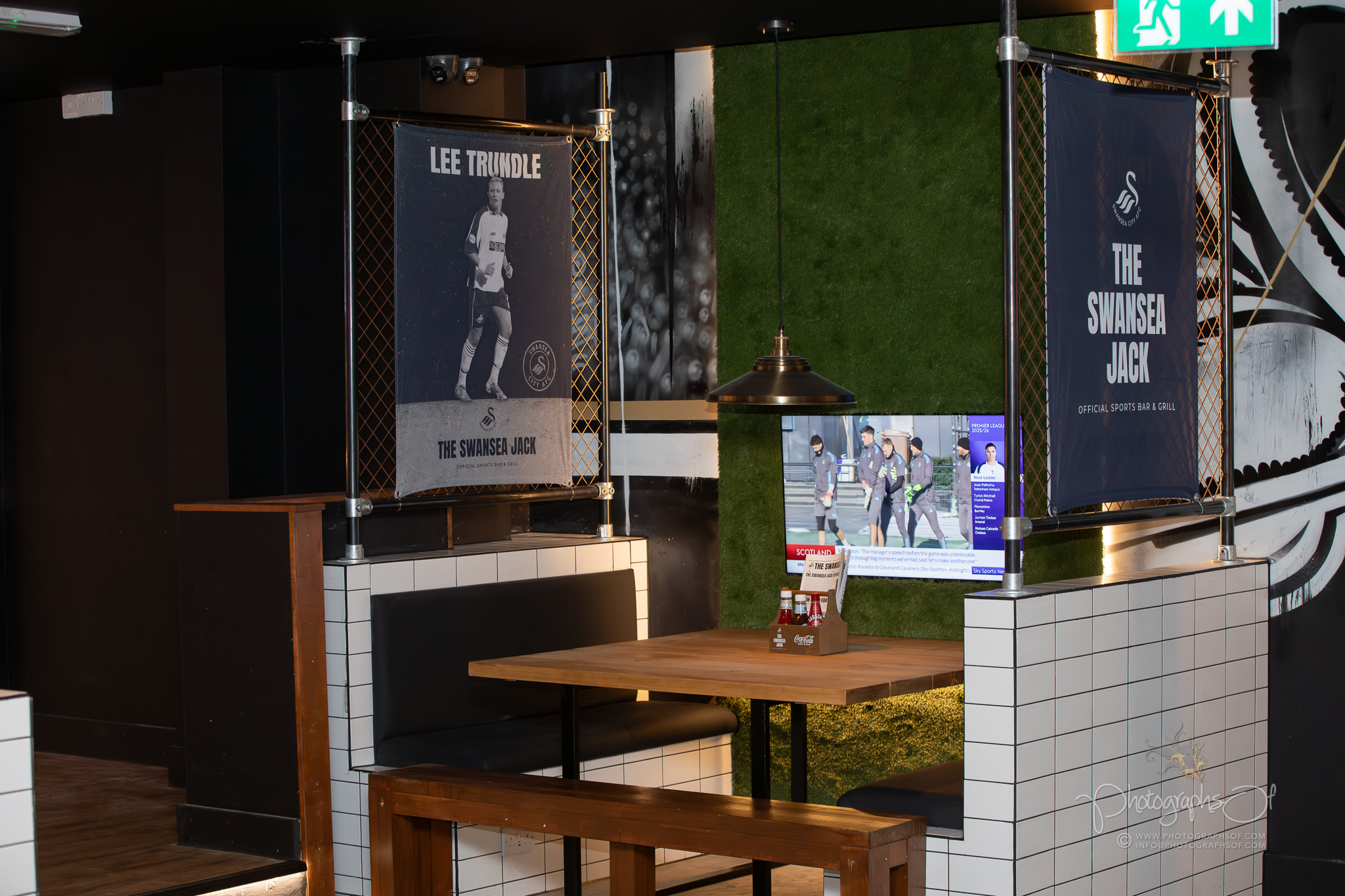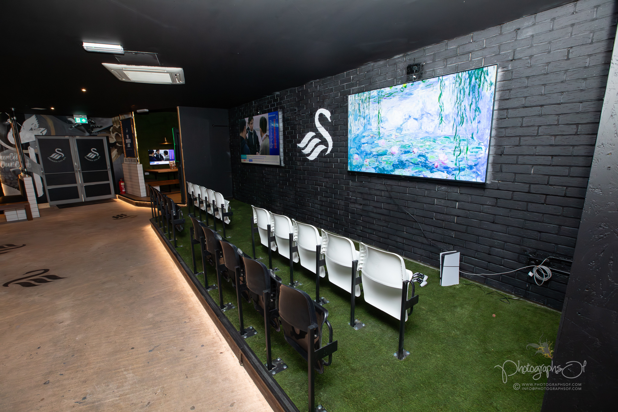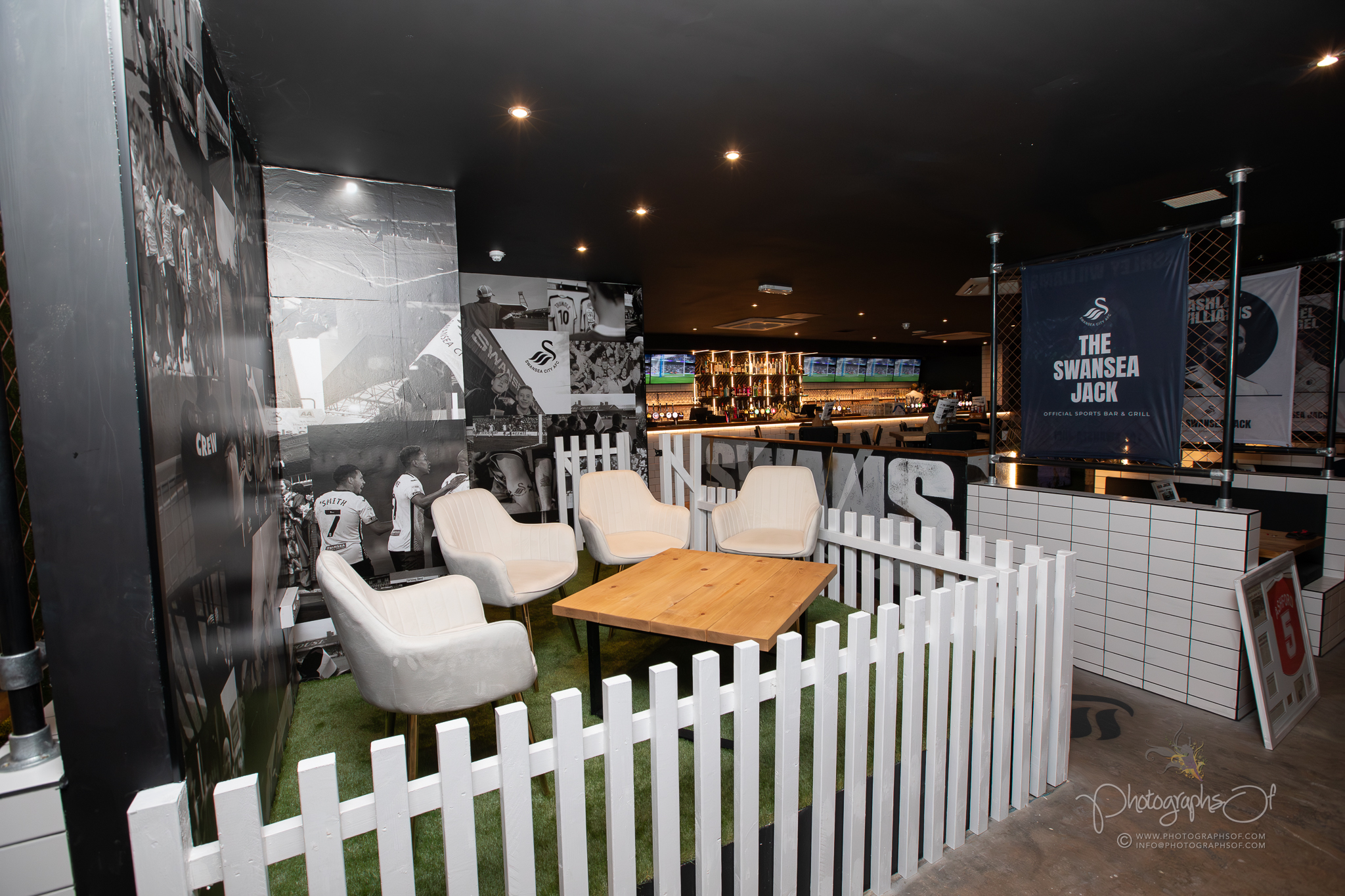 Around the venue, 11 seated booths each celebrate a former Swansea City player, reinforcing the club connection. At the rear, an elevated Astroturf area with black and white stadium-style seating sits in front of 2 striking 200-inch televisions, creating a stadium feel while maintaining comfort. Additional features include a dartboard area with murals by Welsh graffiti artist JenksArt, a foosball zone and a stairwell lined with famous Swans chants, turning every corner into part of the experience.