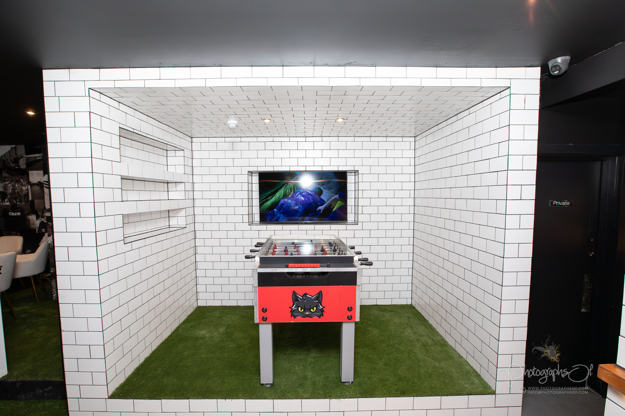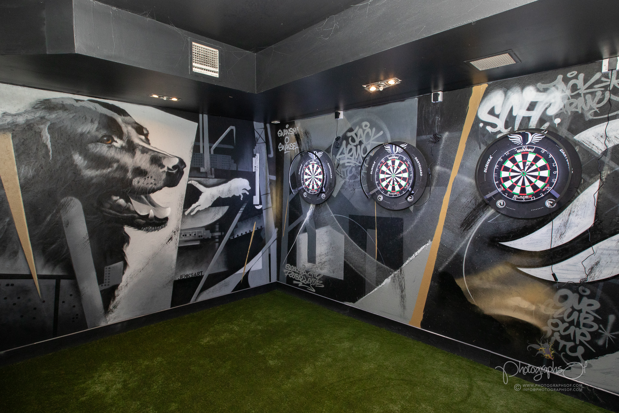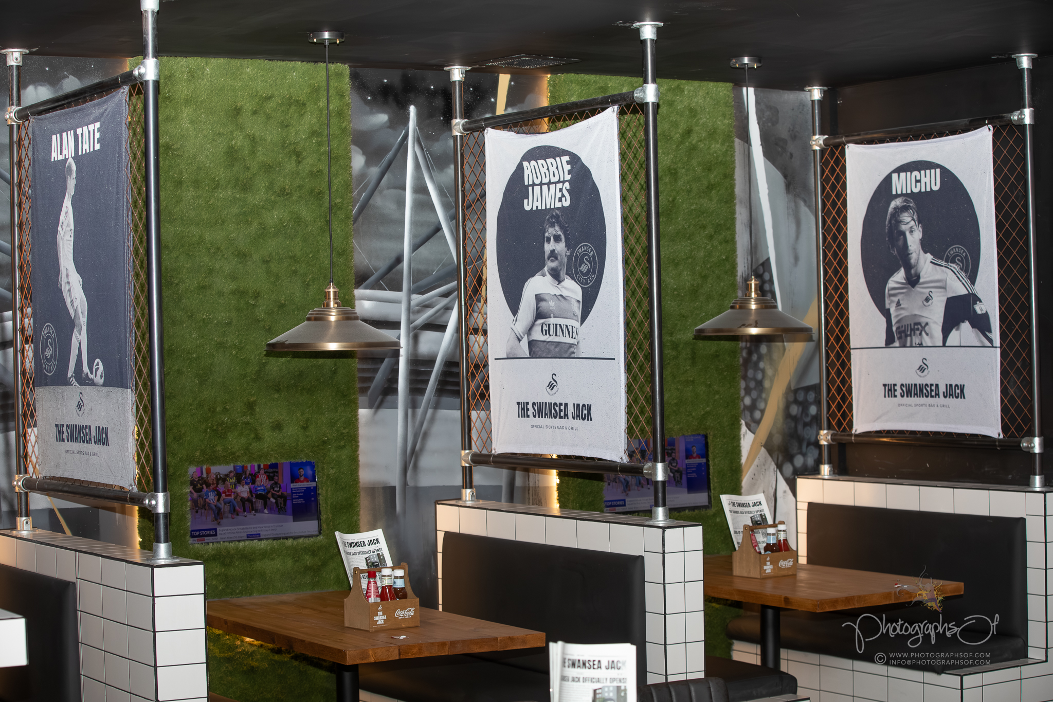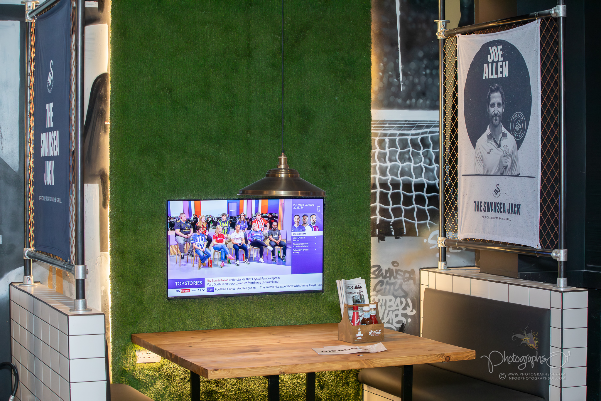 Around the venue, 11 seated booths each celebrate a former Swansea City player, reinforcing the club connection. At the rear, an elevated Astroturf area with black and white stadium-style seating sits in front of 2 striking 200-inch televisions, creating a stadium feel while maintaining comfort. Additional features include a dartboard area with murals by Welsh graffiti artist JenksArt, a foosball zone and a stairwell lined with famous Swans chants, turning every corner into part of the experience.