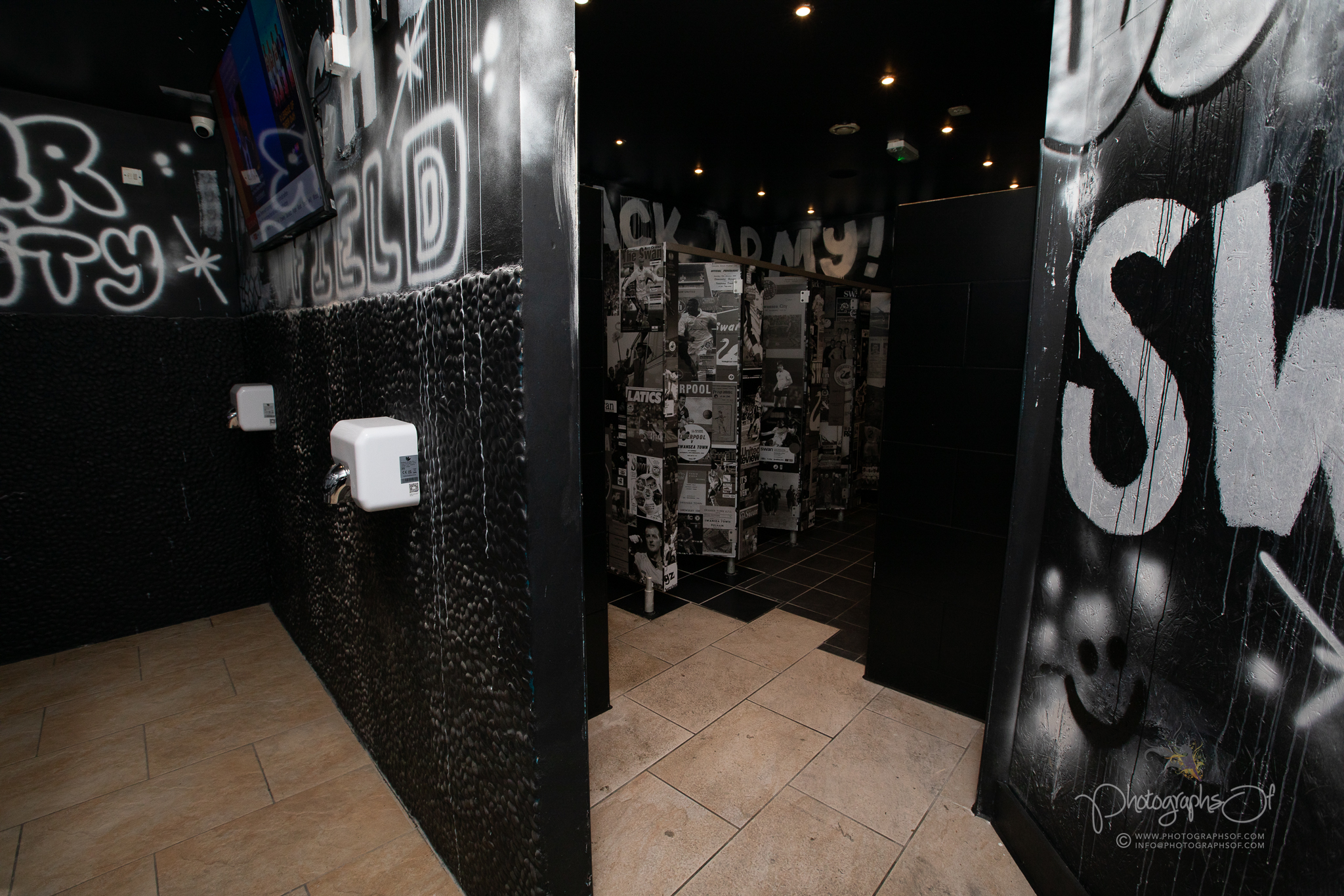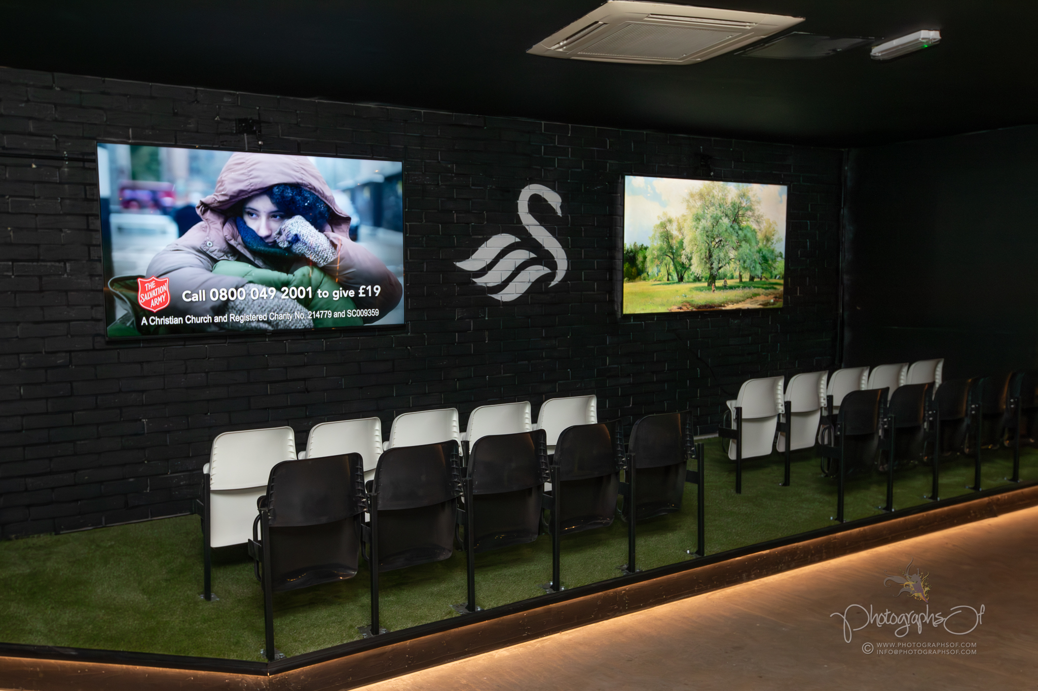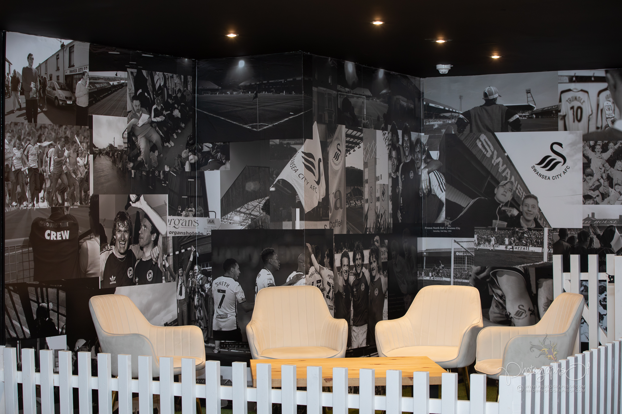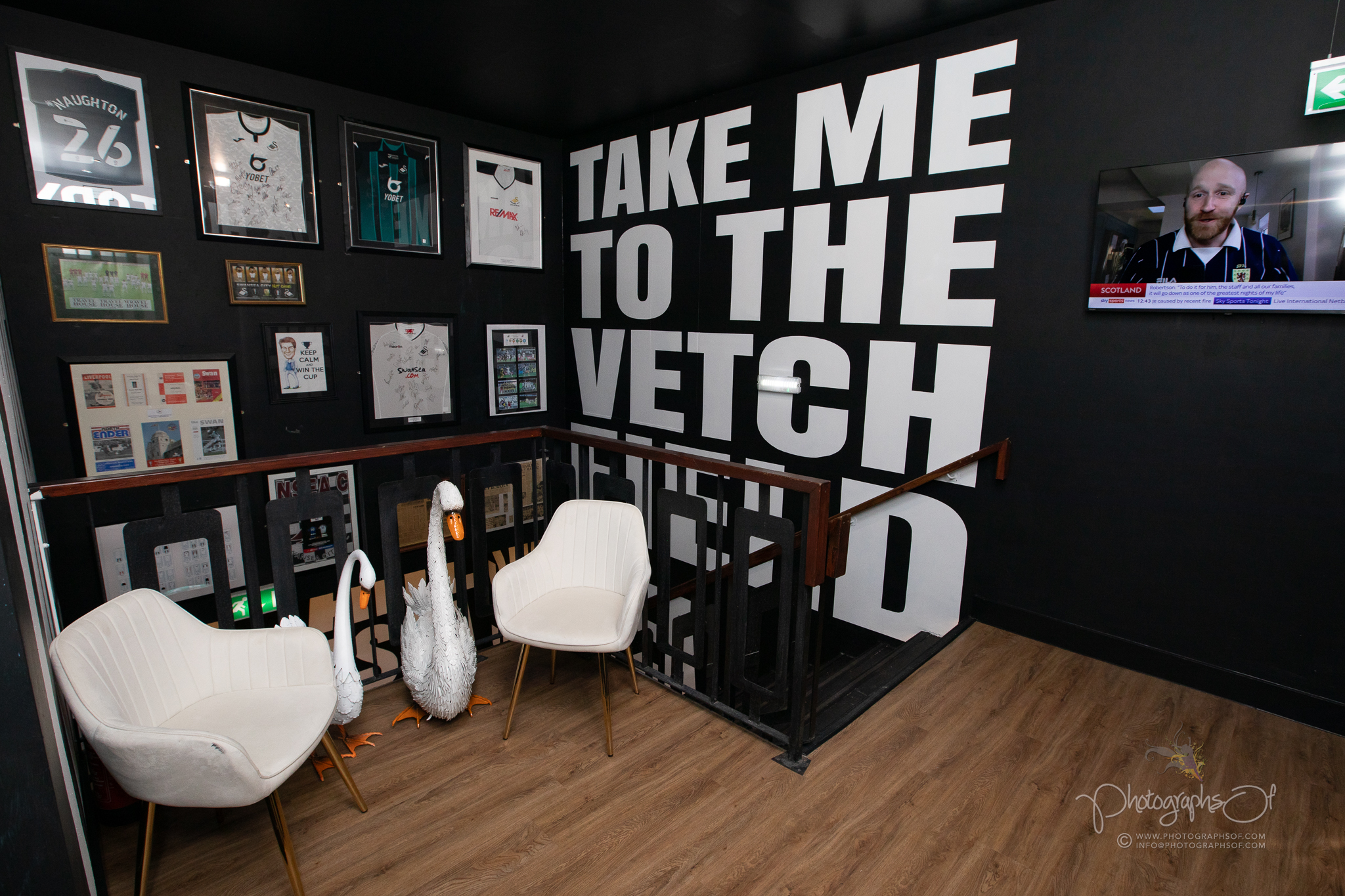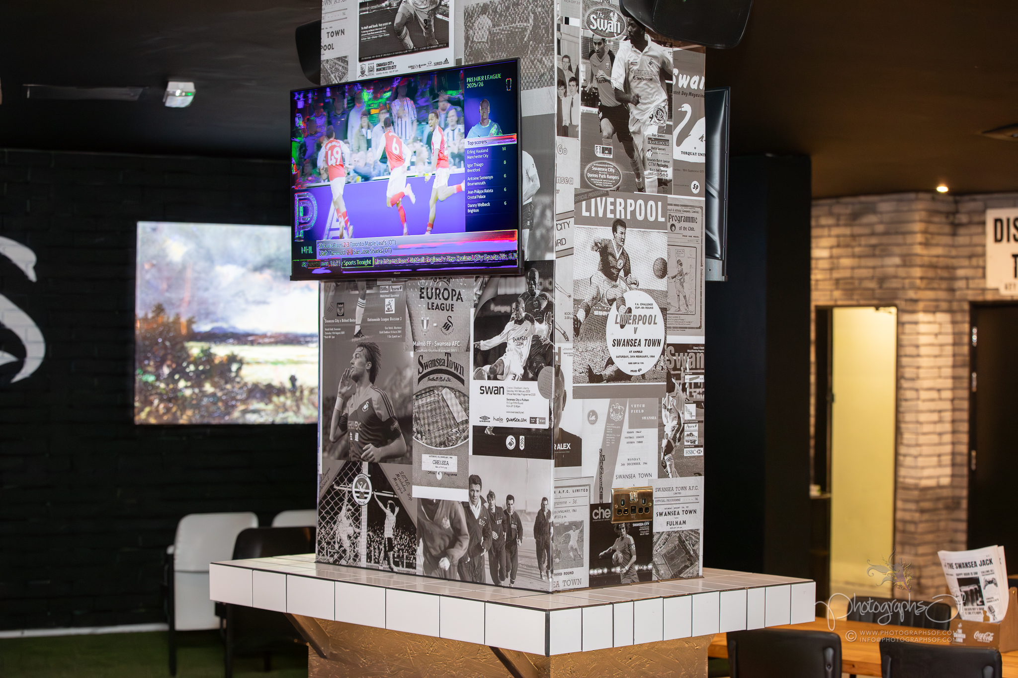 Around the venue, 11 seated booths each celebrate a former Swansea City player, reinforcing the club connection. At the rear, an elevated Astroturf area with black and white stadium-style seating sits in front of 2 striking 200-inch televisions, creating a stadium feel while maintaining comfort. Additional features include a dartboard area with murals by Welsh graffiti artist JenksArt, a foosball zone and a stairwell lined with famous Swans chants, turning every corner into part of the experience.