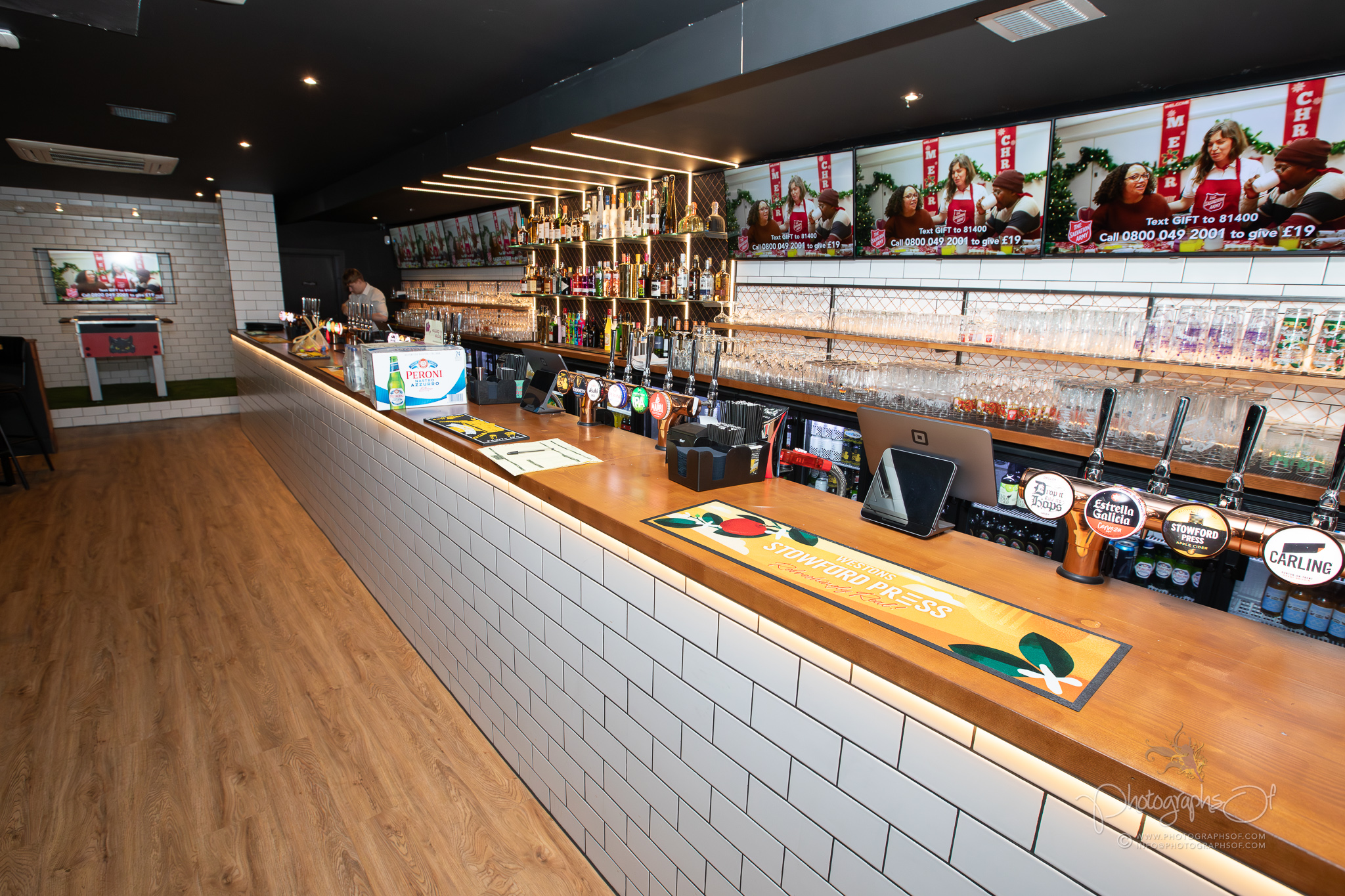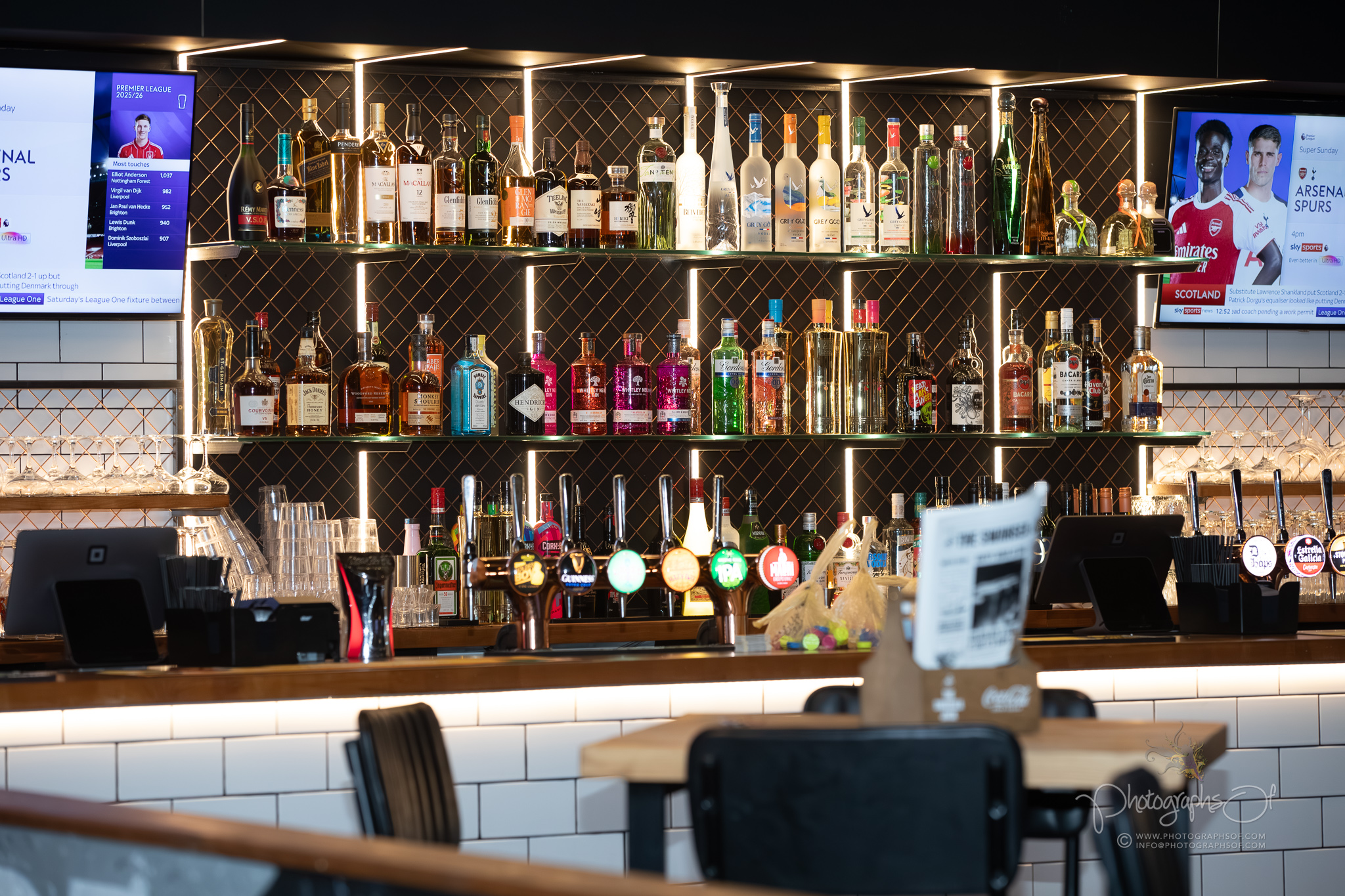 The bar itself required particular care. Translating the design from drawings into reality involved bespoke metalwork, black and white tiling that mirrors the club colours and integrated lighting to showcase spirits and glassware. The finished result is both visually strong and built to withstand the demands of a busy, high-footfall venue.