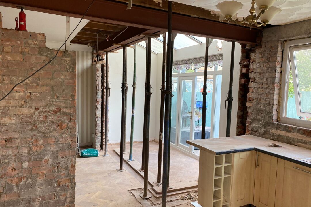 In this project we were asked to create an open plan kitchen and dining space by removing some internal walls and extending into the conservatory installing a pitched roof with roof lights.